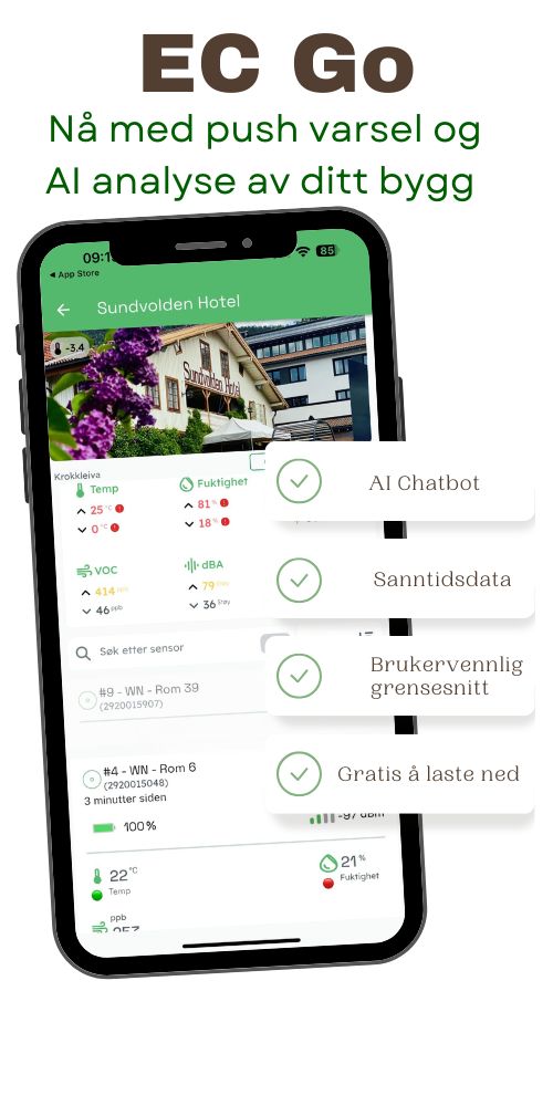 Ved å samle inn og analysere store mengder data fra sensorer, gir EC Go deg full innsikt og kontroll over byggets energiforbruk og inneklima. Dette muliggjør datadrevne beslutninger og identifisering av tiltak som fører til betydelige energibesparelser og et bedre inneklima. Med tidlig varsling kan også potensielle bygningsskader, som fukt og sopp, oppdages og håndteres raskt.