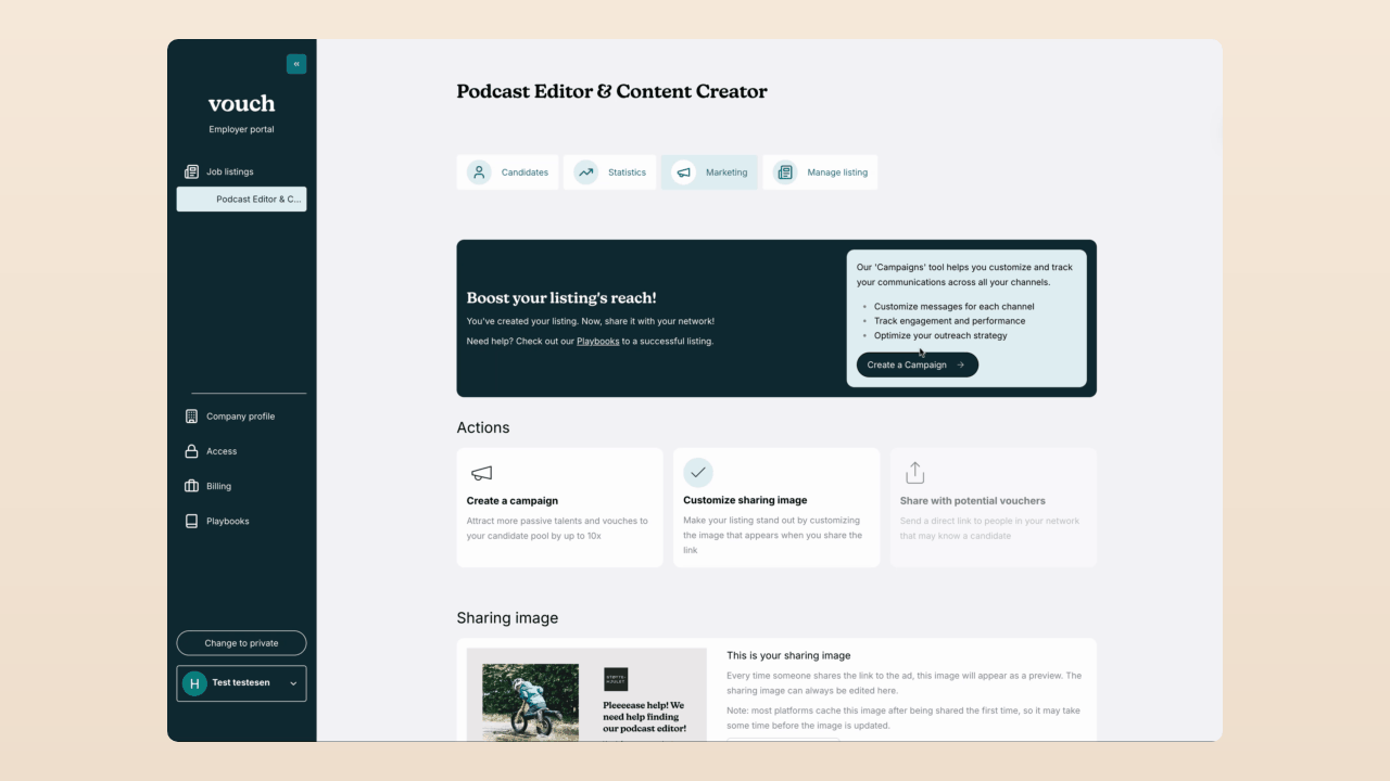 - Add customizable sharing Images: Use Vouch’s tools to create images that align with your brand and appeal to your audience. These visuals can make your job listings stand out and capture attention quickly.
